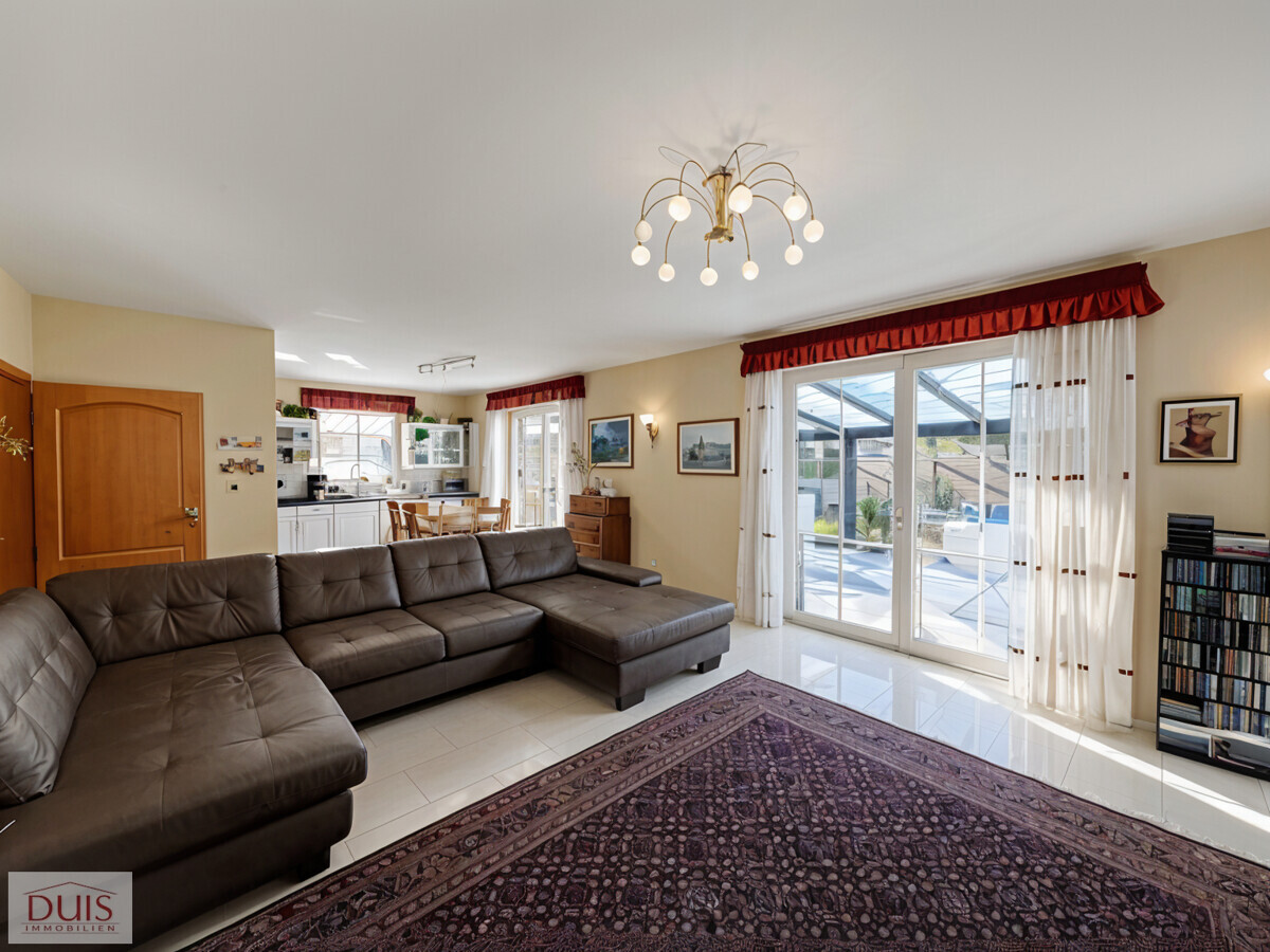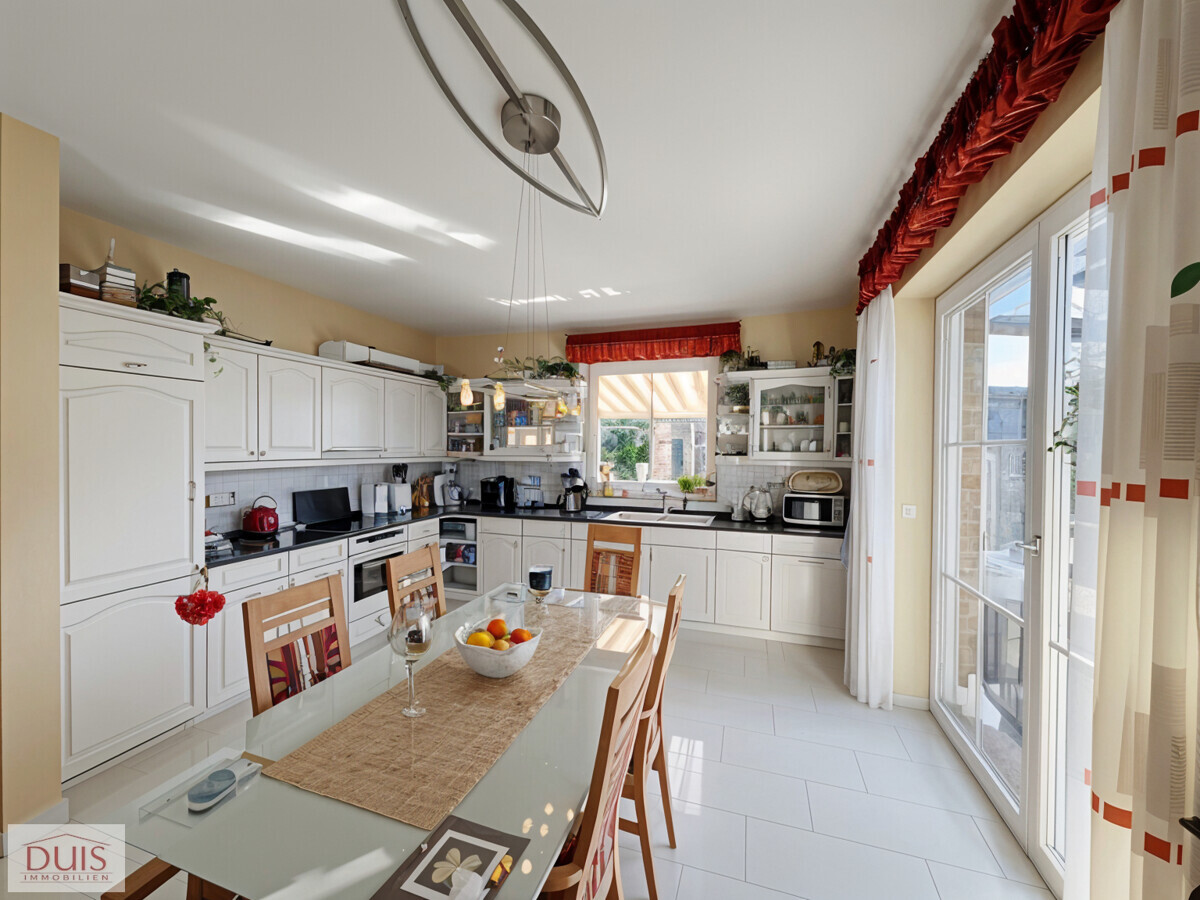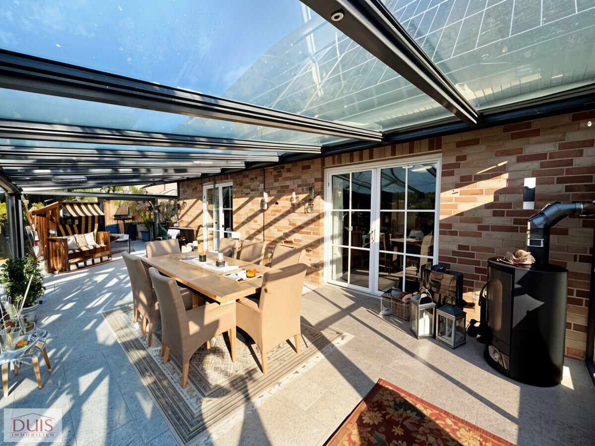 Bereits beim Betreten des Hauses spürt man die durchdachte Planung und hochwertige Ausstattung. Der lichtdurchflutete Wohnbereich öffnet sich zum beeindruckenden Wintergarten aus dem Jahr 2022. Mit einer Größe von ca. 10,5 x 4,2 m, dreifach verglasten Fenstern, zwei Schiebetüren mit Insektenschutz, elektrischen Sonnenrollos und einem gemütlichen Holzofen lädt dieser Raum das ganze Jahr über zum Entspannen ein.