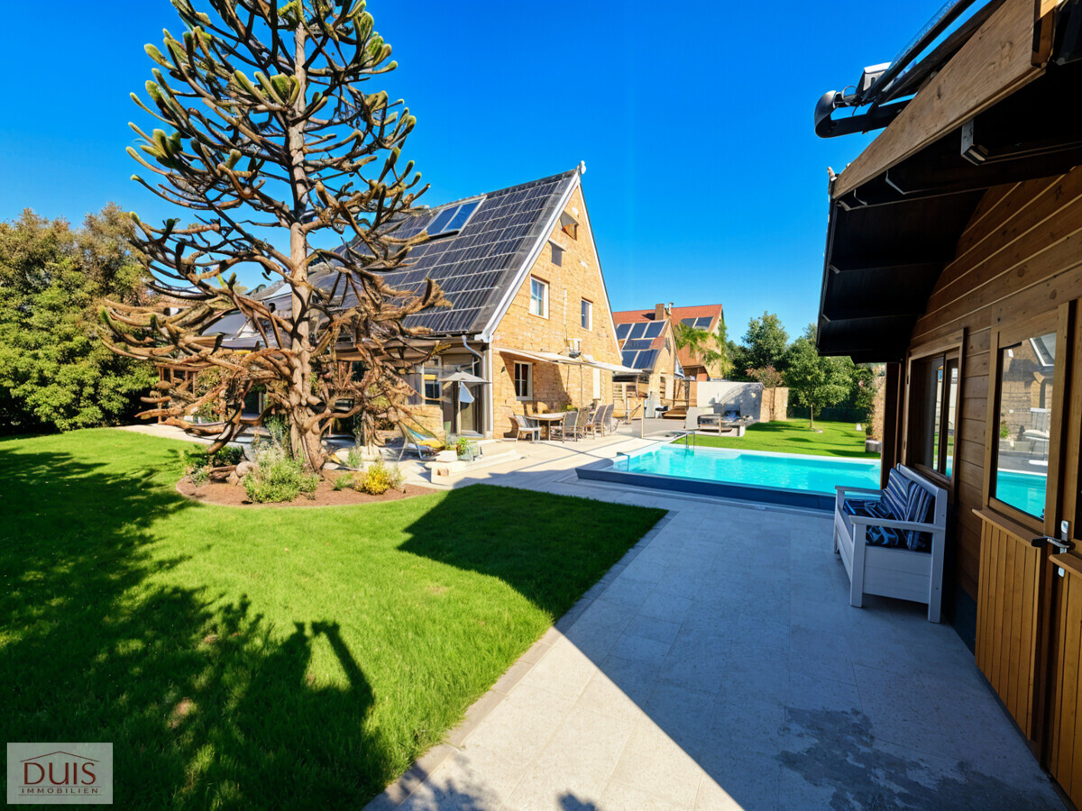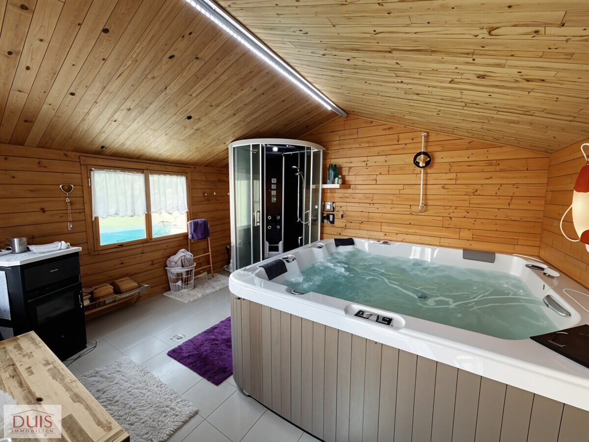 Vom Wintergarten aus gelangt man in den weitläufigen Garten mit großer Terrasse, der mit einem Pool (8 x 4 m, 1,5 m tief) und einem hochwertigen Spa-Haus keine Wünsche offenlässt. Das Spa-Haus ist mit einem Whirlpool, einer Dampfdusche und einem Holzofen ausgestattet – ein privater Wellnessbereich direkt im eigenen Garten. Seit 2025 verschönern zudem drei Hanfpalmen den Poolbereich und verleihen dem Garten ein mediterranes Urlaubsflair.